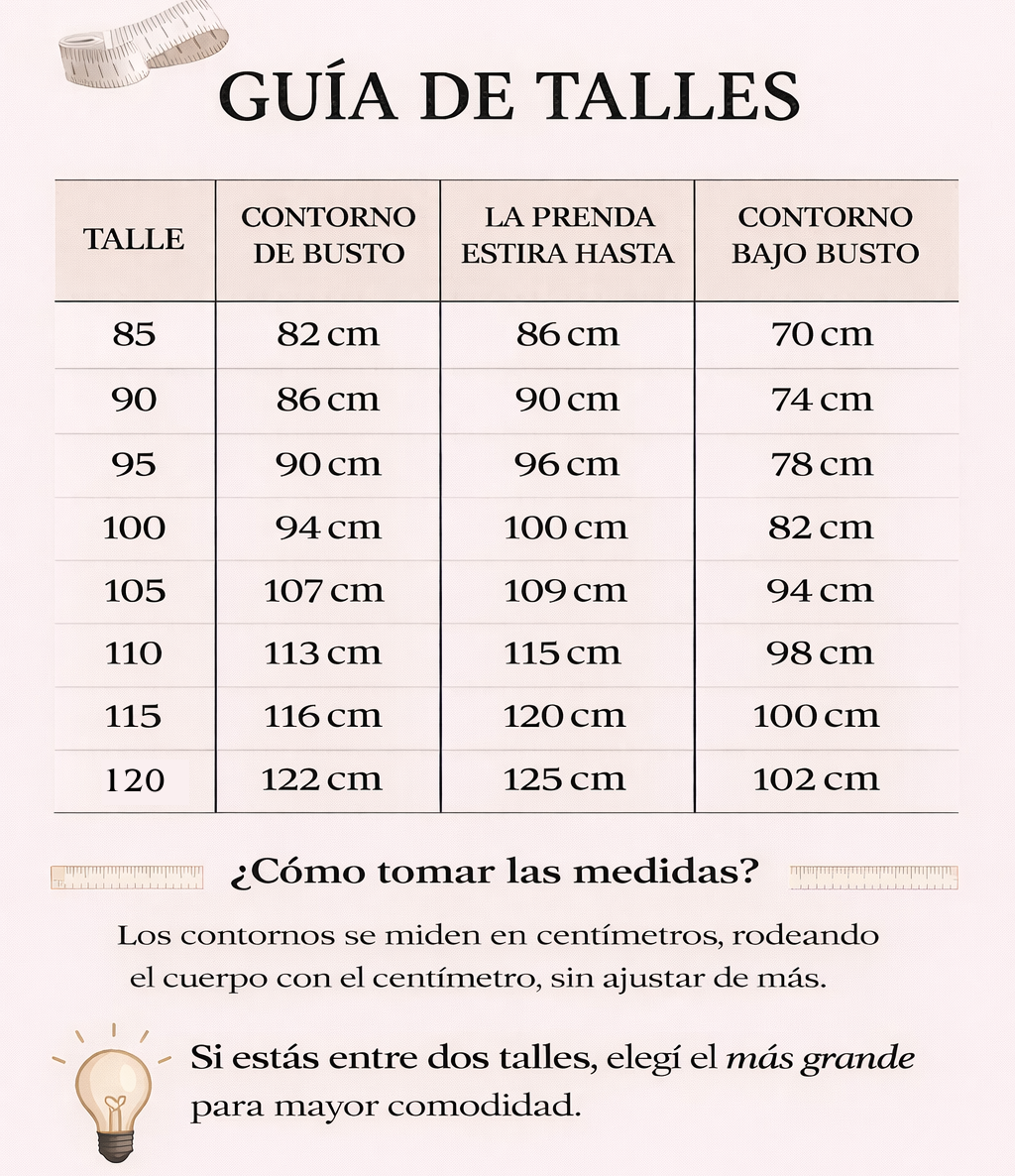 Para mejor soporte, elegí según tu contorno de busto. Si dudás, elegí un talle más para confort diario.